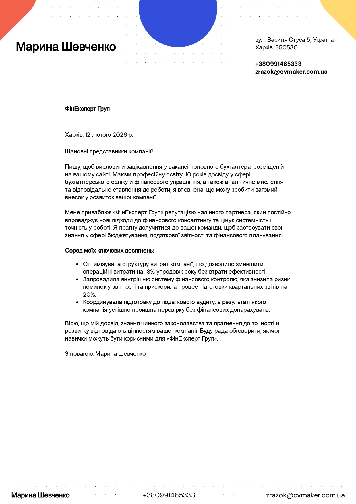 У цьому супровідному листі Марина Шевченко переконливо презентує себе як кваліфіковану кандидатку на посаду головного бухгалтера. Текст чітко структурований: вступ окреслює професійну мотивацію, далі подані релевантні навички та конкретні результати, які підтверджують її управлінський досвід. Формат досягнень – із вимірюваними показниками, він відразу демонструє її внесок в оптимізацію витрат, підвищення точності звітності та успішне проходження аудиту, що є сильними аргументами для роботодавця.