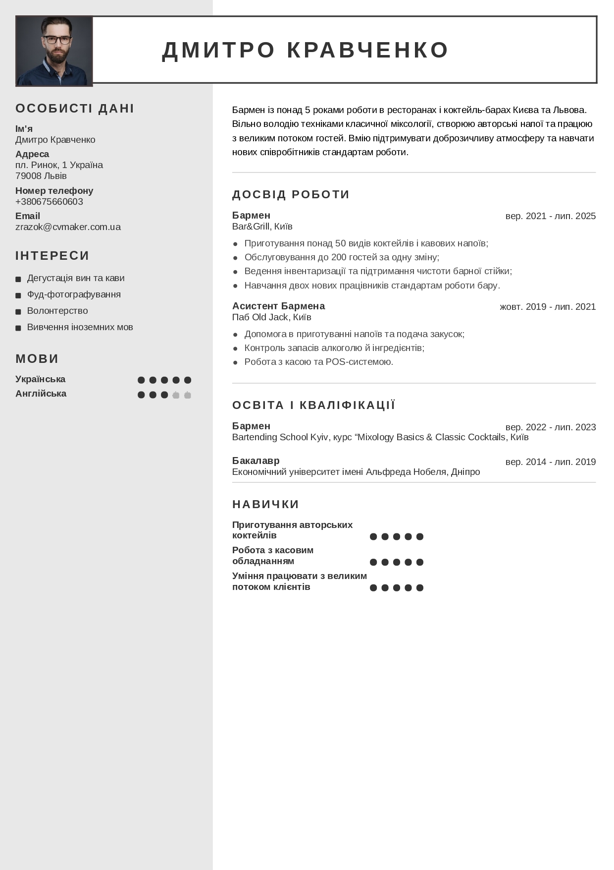 Щоб зрозуміти, як правильно оформити документ, розгляньмо приклад резюме бармена зразок українською. Він підійде кандидатам із досвідом роботи та допоможе показати ключові навички, освіту й досягнення. Ви можете використати цей приклад резюме як основу та адаптувати під власний досвід.