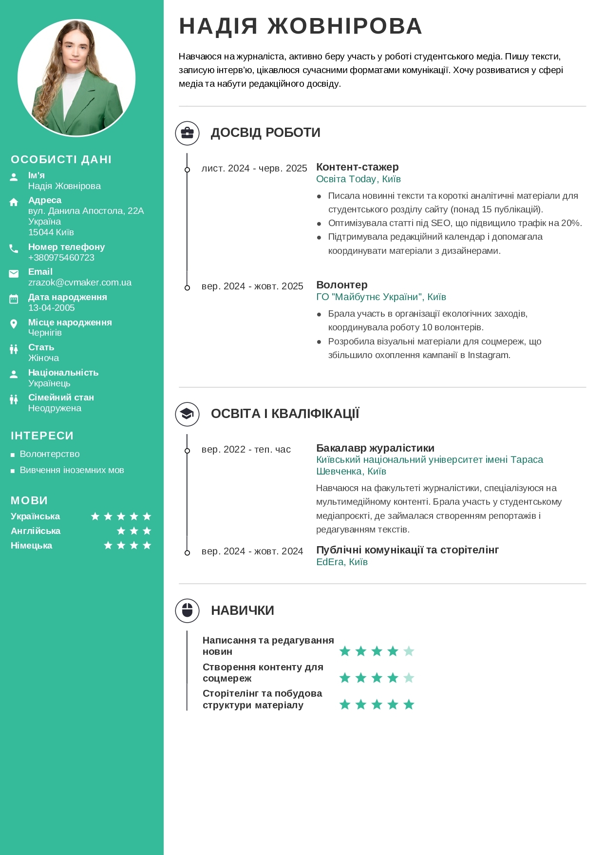 Це резюме представляє Надію Жовнірову – студентку другого курсу факультету журналістики, яка активно розвивається у сфері медіа та комунікацій. У ньому добре видно її перші професійні кроки: досвід створення контенту, роботу з SEO і волонтерську діяльність. Надія вдало підкреслює свої головні вміння – написання текстів, створення матеріалів для соцмереж, структурування контенту. Вона обрала сучасний шаблон резюме з акцентом на навички та навчання. Це дає змогу презентувати себе як відповідальну й мотивовану кандидатку для стажувань у медіасфері.