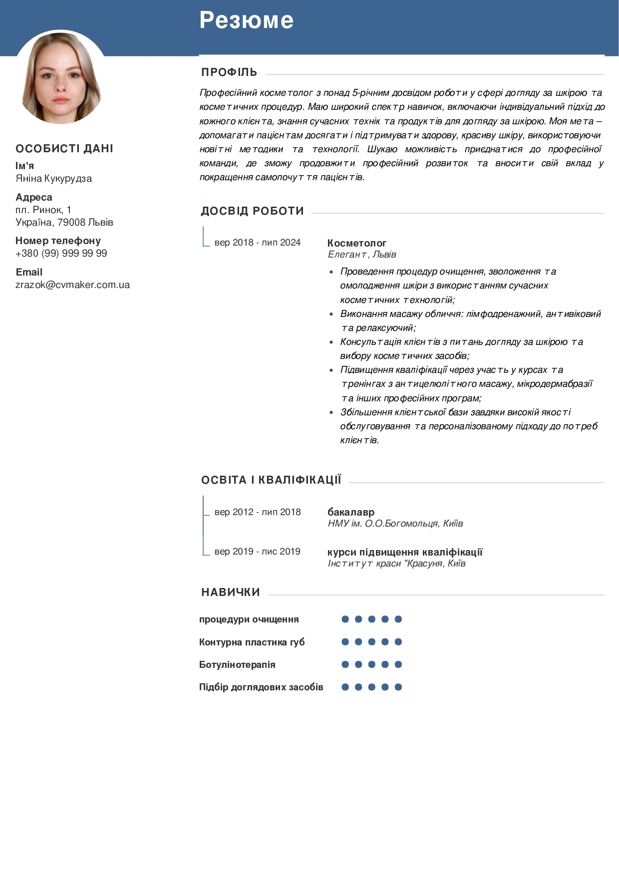 - Підкресліть вашу спеціалізацію, наприклад, догляд за проблемною шкірою чи антивікові процедури. Також вкажіть свої професійні навички та освіту, що стосуються косметології.